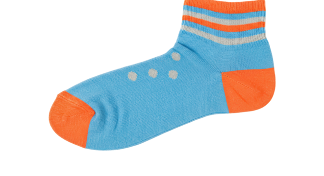 Blue sock with white and gray stripes and accents image, Isolated, Png Transparent Background