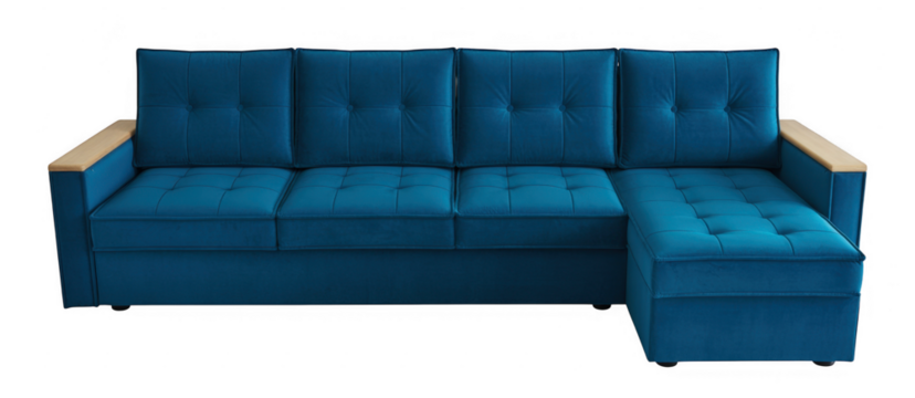 Teal blue velvet sofa with light-wood legs
