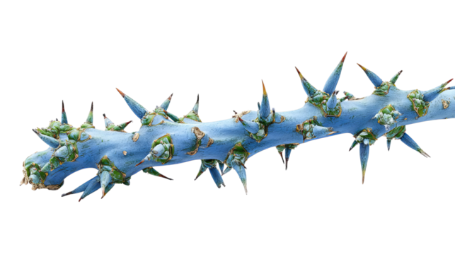 PNG of Close-up of a vibrant blue cactus stem with sharp green-tipped thorns, showcasing nature's unique beauty.