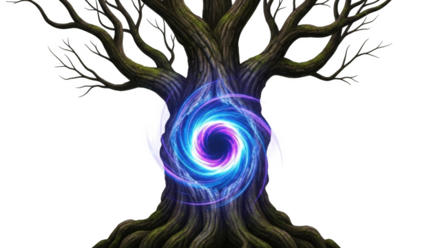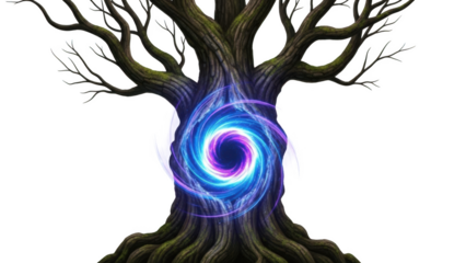 Ancient tree trunk with glowing blue purple energy vortex portal bark roots