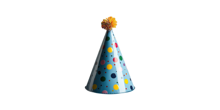 Blue party hat with colorful polka dots isolated on transparent background