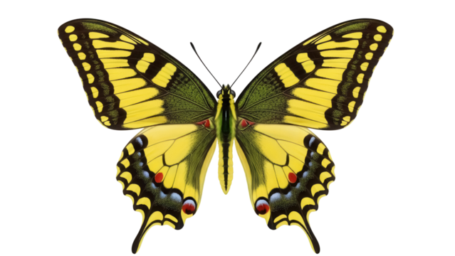 Eastern tiger swallowtail butterfly PNG isolated on transparent background, yellow and black wings with red and blue spots, insect for design