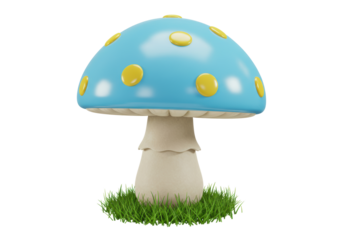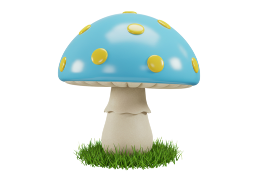 Isolated mushroom with blue cap and yellow spots, cute fantasy clip art, forest fungus