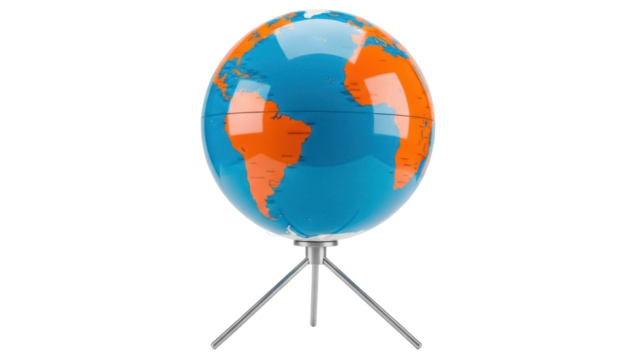 Blue and orange globe isolated PNG, world map on stand for geography education and travel planning, on transparent background