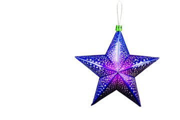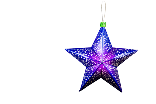 Blue star christmas tree ornament with snowflake pattern hanging, symbolizing winter holidays and festive decorations