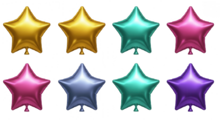 Collection of shiny metallic star balloons isolated on transparent background