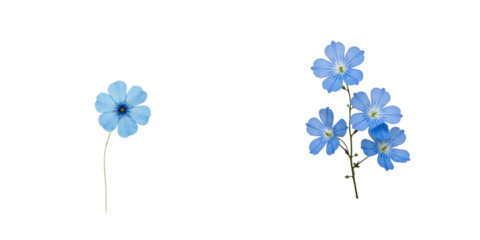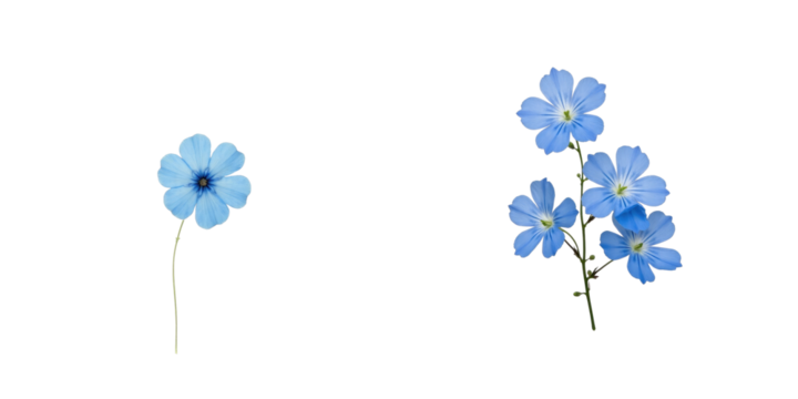 Blue forget-me-not flowers isolated on transparent background featuring single bloom with stem and cluster of blooms with stems arranged dynamically