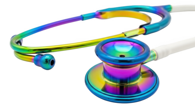 Iridescent rainbow colored stethoscope with white tubing on black background medical equipment healthcare