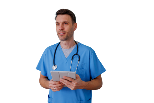 Young female doctor wearing blue scrubs and stethoscope using digital tablet with transparent background
