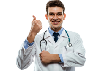Smiling medical professional wearing white coat with stethoscope, transparent background