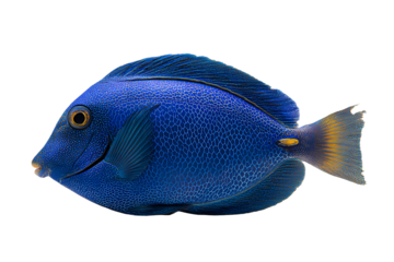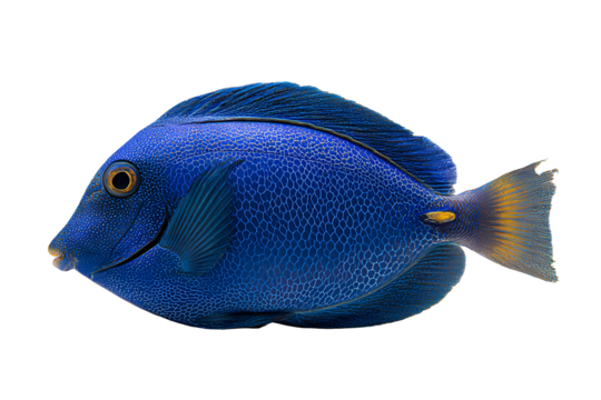 A vibrant blue tang fish, isolated on transparent background, with a striking yellow tail
