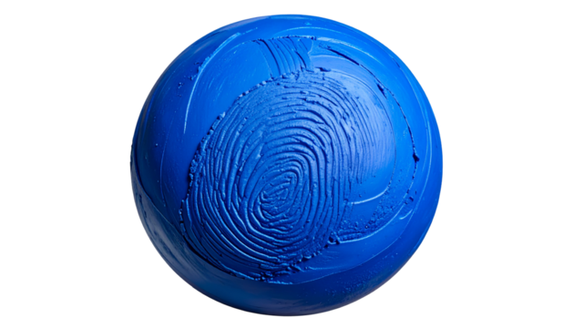 A detailed close-up of a blue, textured sphere with a fingerprint imprint