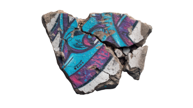 Concrete rubble broken from a wall, displaying colorful graffiti art as a symbolic representation of urban decay and rebellion