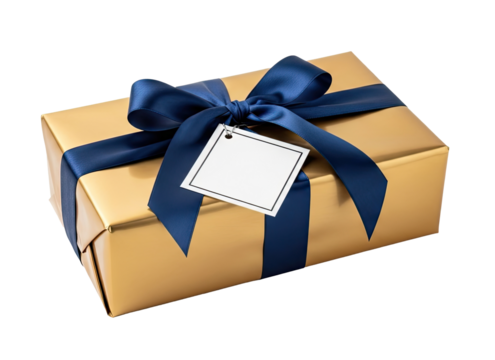 A wrapped gift with a blue ribbon and a white tag on a png transparent