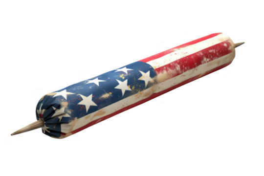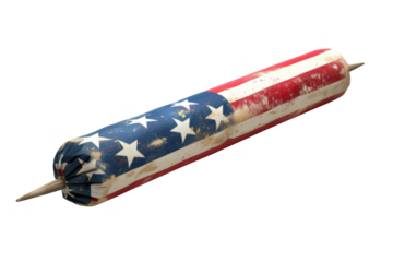 A long, thin, red, white, and blue flag is wrapped around a wooden stick