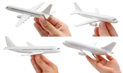 Set of miniature model airplanes in hands, isolated on transparent cutout background