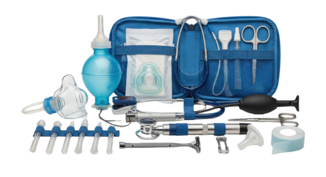 Collection of Professional Medical Examination Equipment Kit with Stethoscope and Blue Tools isolated on Transparent Background