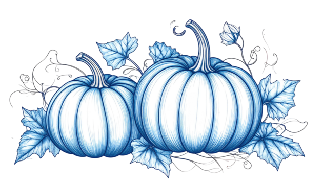 Two stylized light blue pumpkins surrounded by leaves and vines
