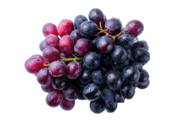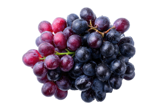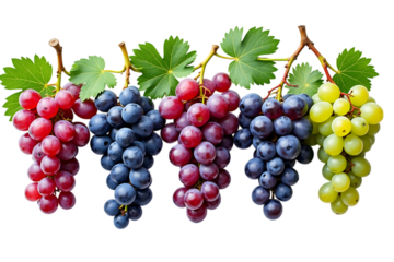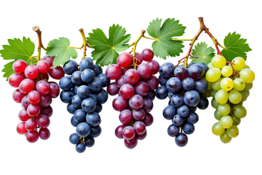 assortment of fresh red, blue, and green grapes on vines, isolated on transparent background