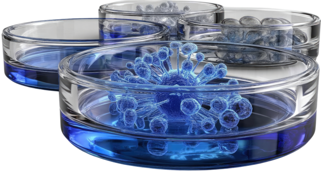 Microscopic Universe in Petri Dishes: A captivating shot of blue virus models inside transparent petri dishes, representing scientific exploration and the microscopic realm.
