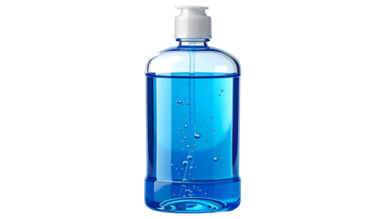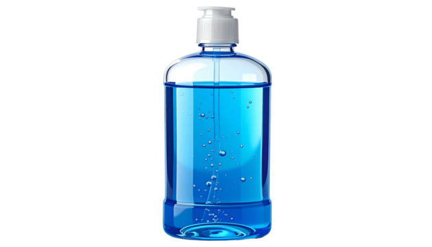 A transparent bottle filled with blue liquid and a white pump dispenser