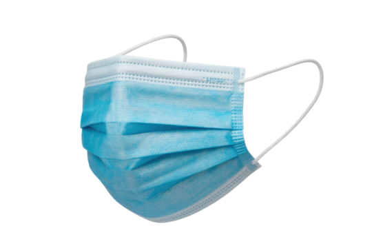 Light Blue Disposable Face Mask with White Ear Loops on Black Background medical protection, Isolated On Png Transparent Background
