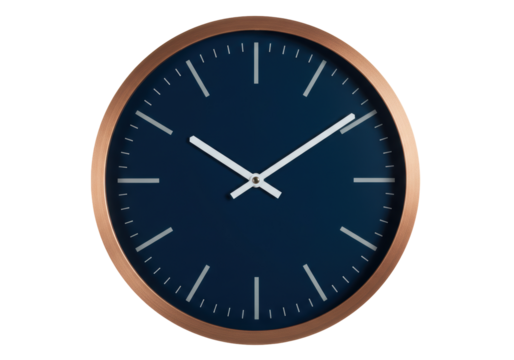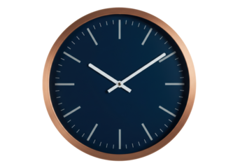 Elegant navy blue wall clock with copper frame isolated PNG, time management and home decor element on transparent background