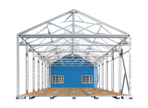 Modern Prefabricated Building Structure with Blue Wall and Wood Floor isolated on a transparent background