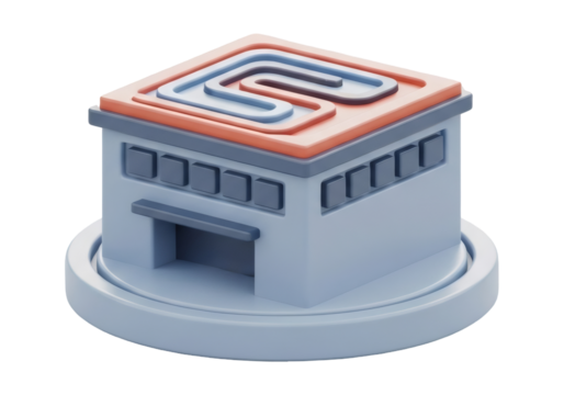 Isometric Warehouse Building with Blue Walls and Red Roof on Black Background
