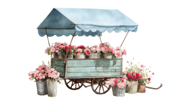 Vintage wooden flower cart filled with pink roses in metal buckets beneath blue canopy isolated on white background