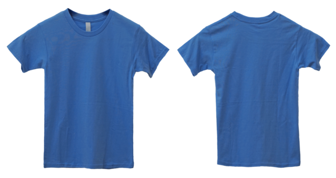 Blue kids t-shirt mock up, front and back view, isolated. Plain light blue shirt mockup. Tshirt design template. Blank tee for print