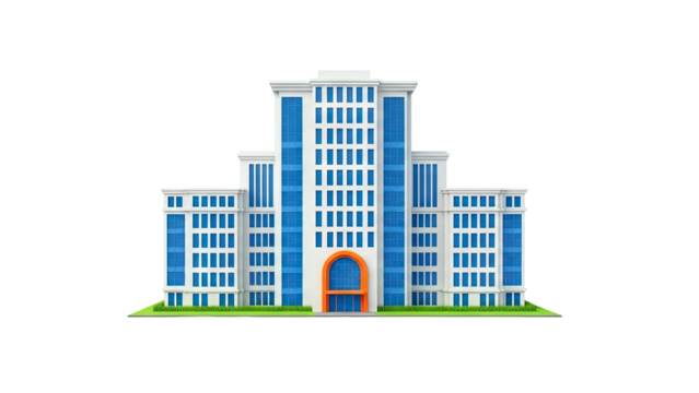 Modern office building with blue windows and gray facade isolated on a transparent background