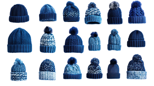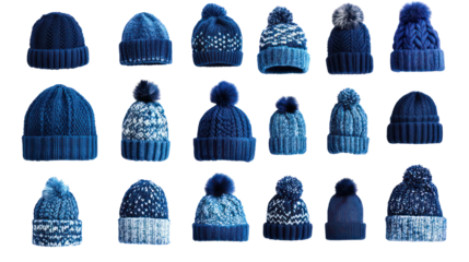 Collection of blue knitted beanies with pom poms, isolated on transparent background
