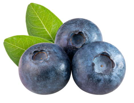 Blueberry isolated png. Blueberry on white or transparent background. Perfect retouched three blueberries no background. Png blueberry with transparent shadow. Full depth of field.