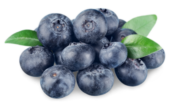 Blueberry isolated png. Blueberry with leaf top view on transparent background. Perfect retouched blueberry with leaves no background. Png blueberries collection. Full depth of field.