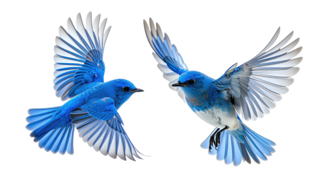 Two bluebirds in flight, wings spread wide against a black background.  Detailed digital illustration