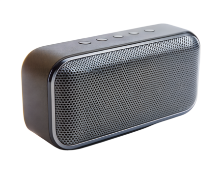 Compact black bluetooth speaker with mesh grille front and minimalist rectangular design for portable audio, isolated on a transparent background