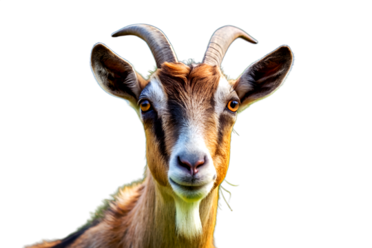 Portrait of a goat on the background of a mountain landscape. isolated on white background