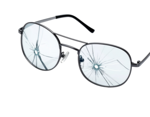 A pair of black-rimmed eyeglasses with both lenses cracked and shattered from a central point of impact.