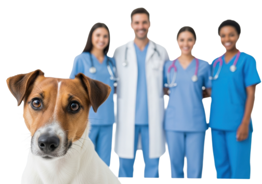 Cute brown and white Jack Russell Terrier dog, head tilted, sharp focus, looking at camera. Softly blurred white studio background with smiling veterinary team. Professional animal care concept