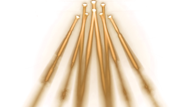 Blurred gold crochet hooks arranged on a white surface