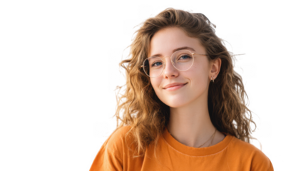 A young woman with curly hair and glasses smiles warmly at the camera. standing against a soft. blurred coastal background. evoking a sense of joy and tranquility perfect for lifestyle imagery
