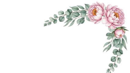 Elegant watercolor corner element featuring peonies and eucalyptus in sage and blush pink isolated on white background