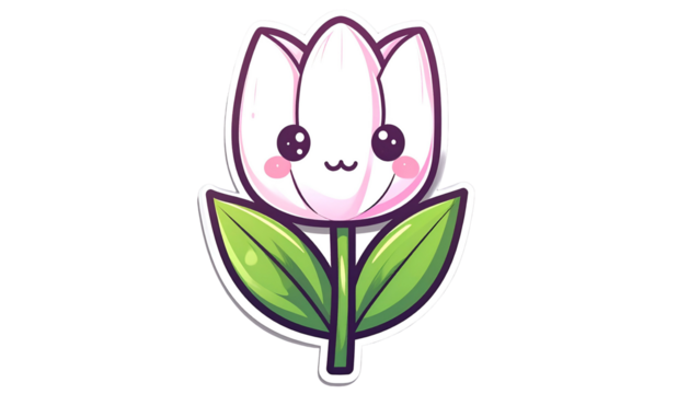Cute cartoon tulip with blushing cheeks, smiling face, and vibrant green leaves