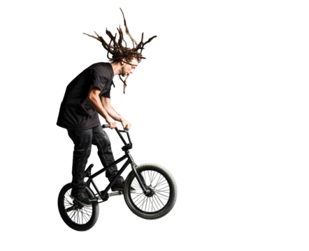 Man jumping and performing tricks on BMX bicycle. Isolated on transparent white background.