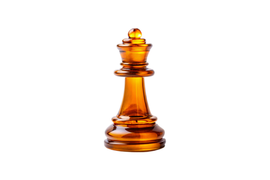 Amber glass chess king piece with ornate crown and elegant proportions, isolated on a transparent background