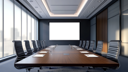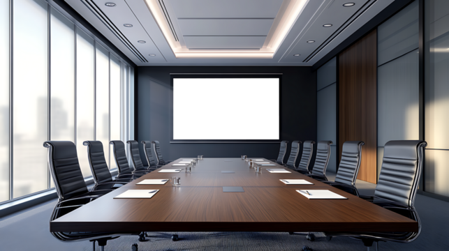 Big white screen in the black meeting room. Empty room for a conference, presentation or forum