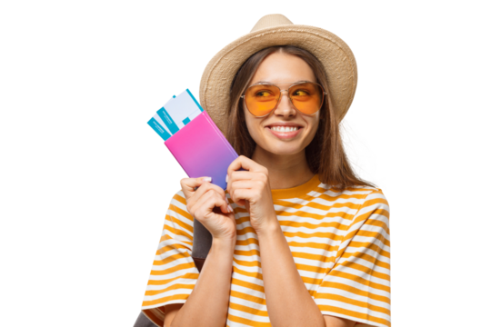 Summer shot of smiling dreamy young female traveller holding passport with flight tickets