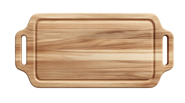 A rectangular wooden cutting board with a handle and juice groove, perfect for kitchen prep or serving, isolated on a clean background. background removed