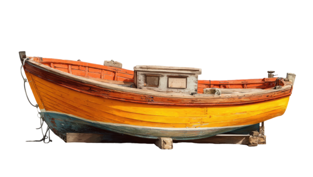 Old Fishing Boat: A vibrant, weathered fishing boat with a charming, rustic aesthetic rests, evoking tales of seafaring adventures and maritime history.